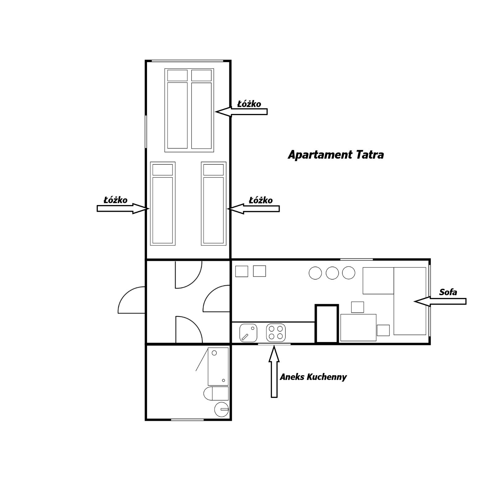 Das Wohnzimmer ist mit einer kleinen Kochnische verbunden worden. Zur Verfügung stehen hier auch ein Sofabett, Kaffeetisch und ein TV. Im Badezimmer gibt es eine Duschkabine. Alle Räume sind durch ein kleines Vorzimmer verbunden.